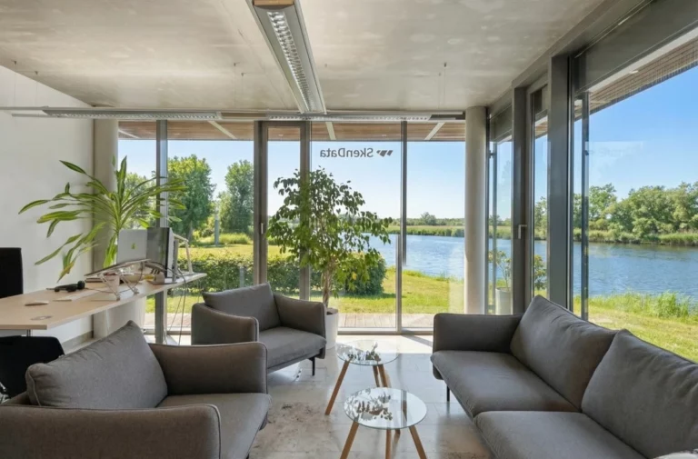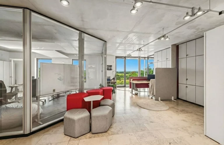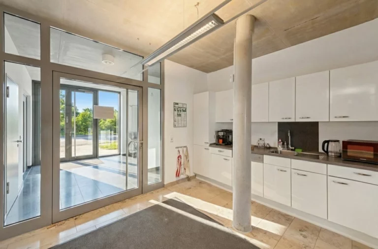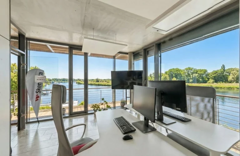Die Gesamtfläche beträgt ca. 506,4 m². Davon entfallen ca. 330,8 m² auf Büroflächen im Erd- und ersten Obergeschoss sowie ca. 175,6 m² auf die Wohneinheit im Dachgeschoss. Die Ausstattung ist gehoben und umfasst unter anderem Fußbodenheizung, Natursteinböden, hochwertige Sanitärausstattung, eine Buderus-Brennwert-Gasheizung sowie eine Otis-Aufzugsanlage. Auf dem Grundstück stehen 11 Stellplätze zur Verfügung. Der zur Warnow ausgerichtete Außenbereich ist mit einer Gabionen-Uferbefestigung und Bangkirai-Stegbelag gestaltet und bietet nicht nur einen unverbaubaren Blick auf das Wasser, sondern auch die Möglichkeit eines direkten Zugangs zur Warnow, etwa für SUP oder Kanufahrten.