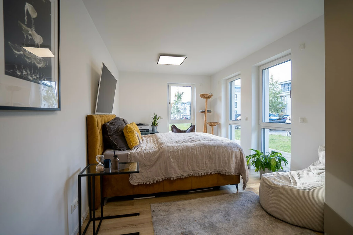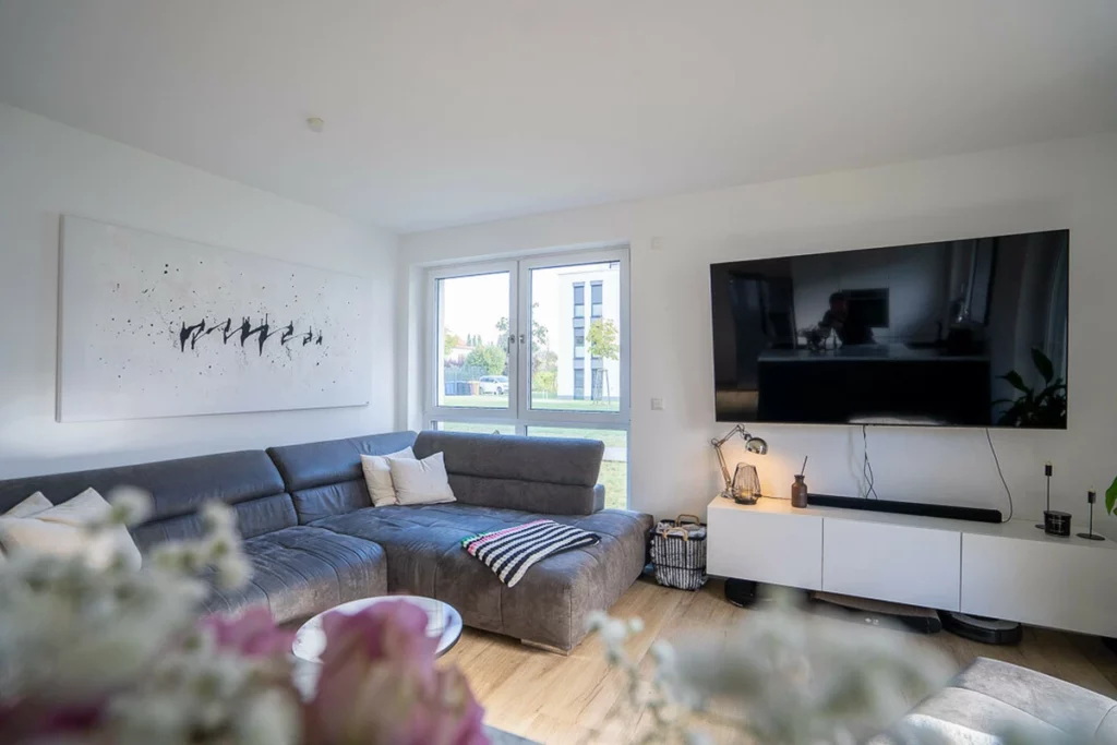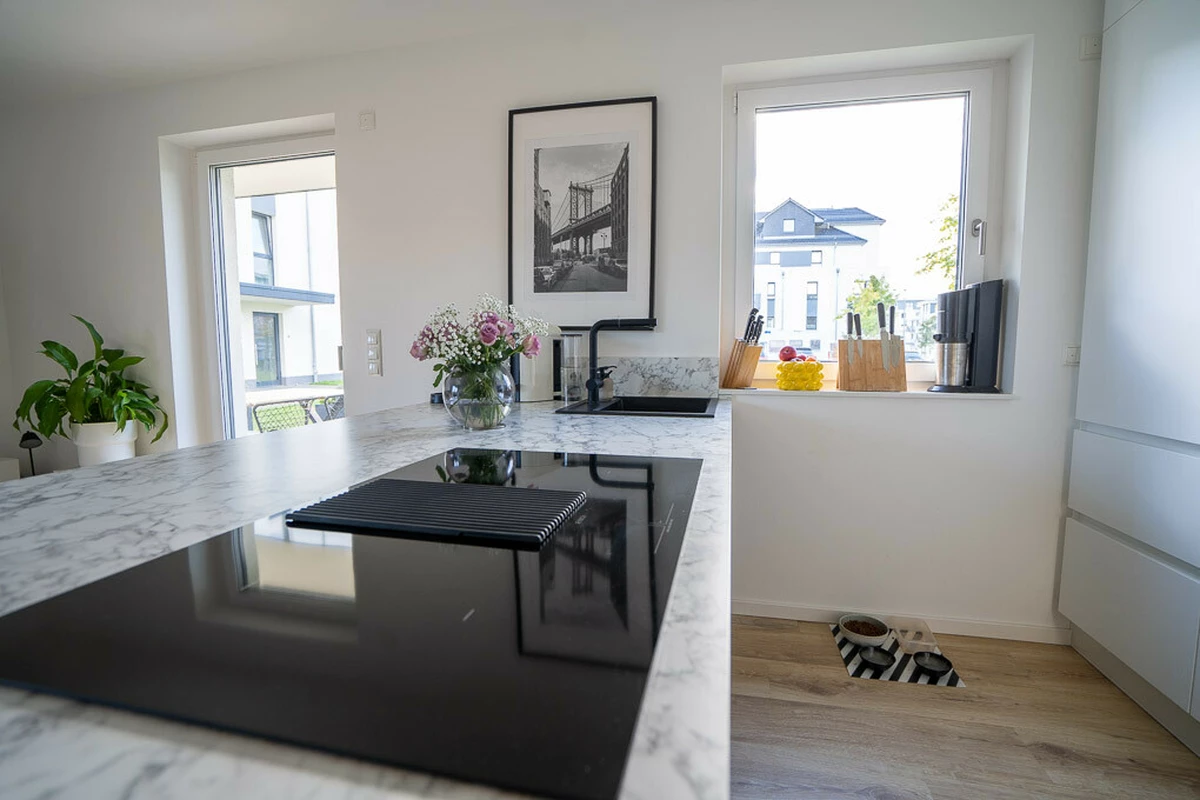 Diese moderne 3-Zimmer-Eigentumswohnung vereint stilvolles Wohnen, hochwertige Ausstattung und ein ruhiges, gepflegtes Wohnumfeld in idealer Weise. Die Wohnung befindet sich im Erdgeschoss eines im Jahr 2021 fertiggestellten Mehrfamilienhauses mit lediglich zehn Wohneinheiten – ein überschaubares, harmonisches Wohnensemble, das von einer angenehmen Nachbarschaft und moderner Architektur geprägt ist. Auf rund 84 m² Wohnfläche erwartet Sie ein durchdachter Grundriss mit lichtdurchfluteten Räumen und einer rundum hochwertigen Ausstattung. Der offene Wohn- und Essbereich mit integrierter Küche bildet das Herzstück der Wohnung. Die stilvolle Einbauküche mit eleganter Kücheninsel, hochwertigen Markengeräten und einem Kochfeld mit integriertem Dunstabzugssystem fügt sich perfekt in das moderne Wohnkonzept ein und lädt zum gemeinsamen Kochen und Verweilen ein. Bodentiefe Fenster sorgen für eine freundliche, helle Atmosphäre und schaffen einen fließenden Übergang zur überdachten Terrasse mit angrenzendem Gartenanteil – ideal für entspannte Stunden im Freien. Zwei komfortable Schlafzimmer bieten vielseitige Nutzungsmöglichkeiten, etwa als Eltern-, Kinder- oder Arbeitszimmer. Das großzügige Vollbad überzeugt mit moderner Gestaltung, ebenerdiger Dusche, Badewanne und stilvollen Details. Abgerundet wird das Raumangebot durch einen separaten Hauswirtschaftsraum mit Anschlüssen für Waschmaschine und Trockner. Hochwertige Materialien, Fußbodenheizung in allen Räumen, elektrische Rollläden sowie dreifach verglaste Fenster unterstreichen den modernen Wohnstandard dieser Immobilie. Ein Kellerabteil sowie ein eigener PKW-Stellplatz komplettieren das attraktive Gesamtbild.